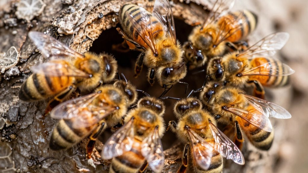 Not all worker bees participate equally in the decision-making process. While some scout and present nest site options, the queen’s influence and hive memory shape the overall consensus. Worker bees that gather information use their experience and hive memory to evaluate options, but the queen’s pheromones subtly sway their choices. This collective effort guarantees the hive makes a balanced decision, with some bees more active in voting than others.