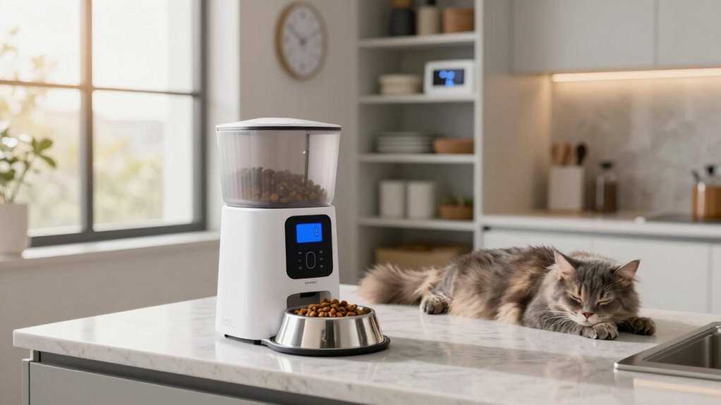 Think of an auto-feeder as an investment that pays off over time. You’ll need to do a cost analysis upfront, considering purchase price and installation. Maintenance costs are usually minimal, but factor in occasional refills and repairs. While initial expenses can seem high, the convenience and consistency it offers might save you money on pet care and reduce stress, making it a smart, long-term choice.