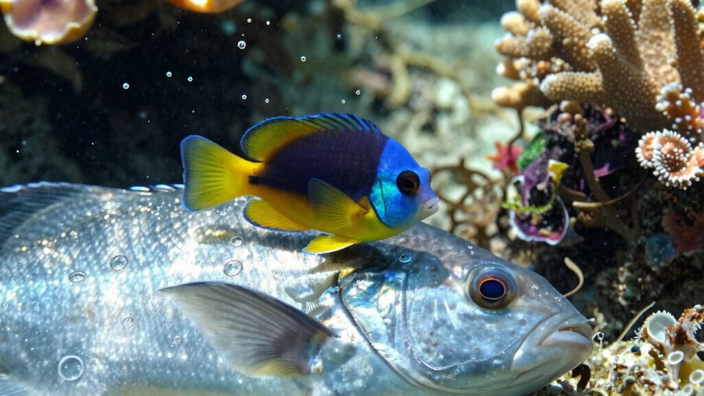 Yes, there are risks involved in fish cleaning interactions. While mutual benefits, like parasite removal and cleaner fish gaining food, are common, conflicts can arise from territorial disputes. You might see cleaner fish accidentally bite healthy tissue or provoke defensive reactions from hosts. These interactions rely on trust, but disputes over space or access can lead to aggressive behavior, making the relationship potentially risky for both fish.