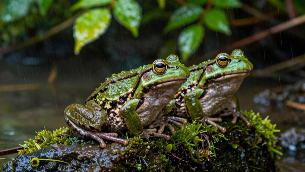 The increased calling frequency isn’t just random noise; it’s an adaptive behavior shaped by evolution. Frogs have learned that rain and humidity improve their chances of attracting mates and ensuring their offspring survive. This weather-dependent communication strategy helps them optimize their reproductive efforts during the most advantageous times. As a result, after rainfall, you’re likely to hear a lively chorus of frogs, a natural symphony driven by the intricate relationship between amphibian communication and weather influence. It’s a reminder of how finely tuned these creatures are to their environment and how *important* weather conditions are to their life cycle.