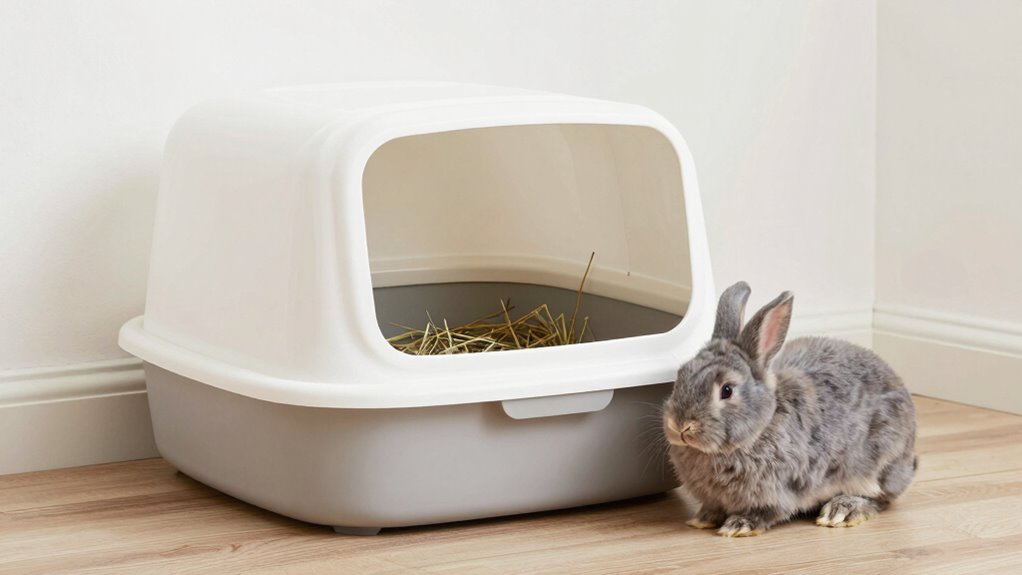 To guarantee your rabbit feels comfortable and has enough space to move, selecting the right size and design for the litter box is essential. A well-chosen size promotes natural behaviors and keeps your rabbit happy. When contemplating litter box aesthetics, opt for a model that blends seamlessly into your rabbit enclosure integration, making cleaning easier and maintaining a clean look.