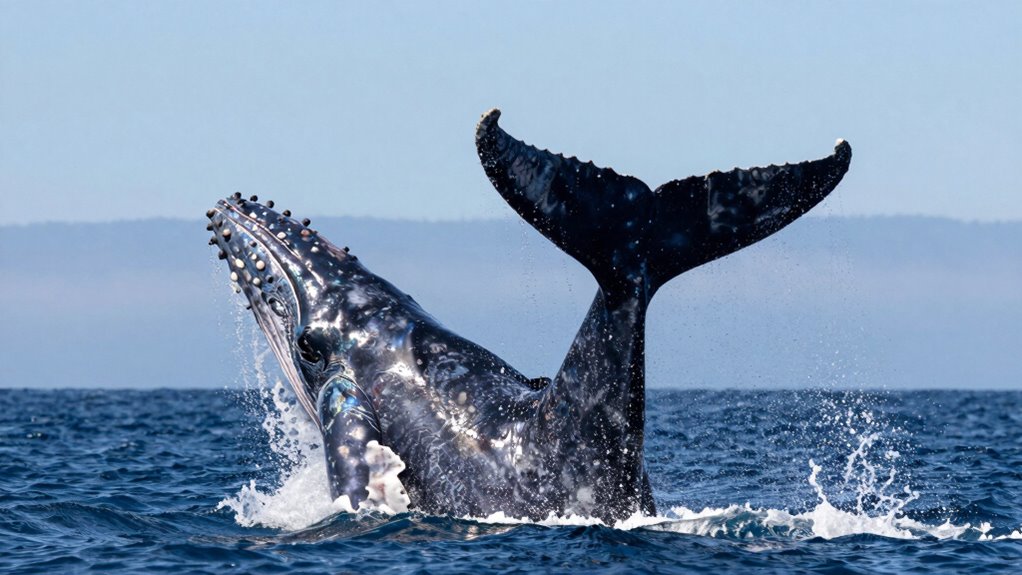 Whale tail slaps are like vocal fireworks, signaling more than just surface activity. You can see them as breaching signals, capturing attention during vital moments. These powerful displays often foster social bonding, serving as non-verbal communication in the vast ocean. They’re not just about showing strength; they’re about connecting with others, sharing intent, and reinforcing social hierarchies within their pod.