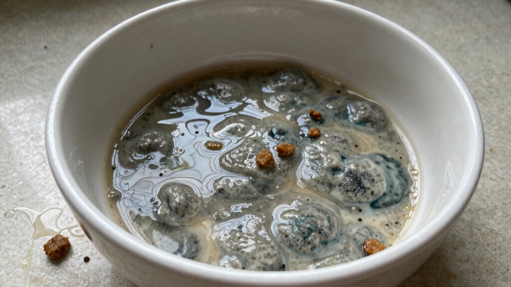 Think of mold growth on wet food like a sneaky shadow creeping across a wall. During visual inspection, mold may appear as fuzzy patches, green, white, or black spots, or slimy textures. Mold identification is vital; if you see any of these signs, discard the food immediately. Don’t take chances—trust your eyes to spot those hidden dangers, ensuring your cat stays safe from harmful toxins.