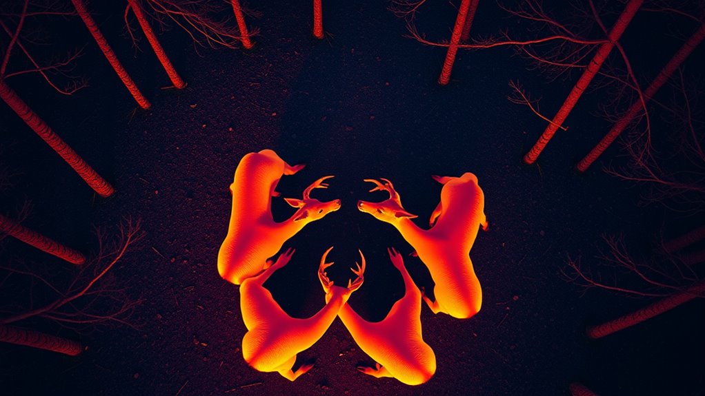 Using drone-mounted thermal cameras, researchers have uncovered complex social groups among deer called “friendship circles.” These nighttime gatherings are deliberate and serve purposes like predator protection and social bonding. The thermal images reveal organized interactions and subtle communication, all captured without disturbing the animals. This innovative method offers new insights into deer behavior and social structures. If you keep exploring, you’ll discover more about how this technology transforms wildlife studies.