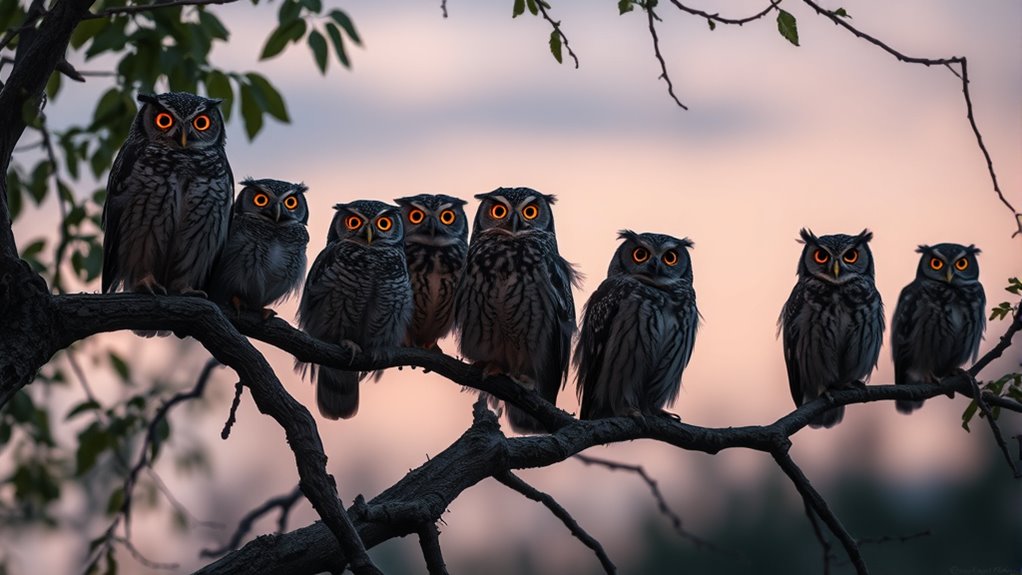 Owls generally prefer to live alone rather than in groups. Their social behavior tends to be solitary, especially during nesting habits. You’ll often find them roosting alone in trees or hidden spots, as they’re more focused on hunting and maintaining territory. While some species may tolerate others nearby, they usually don’t form tight-knit groups. So, if you’re hoping to see a gathering of owls, you might be disappointed.