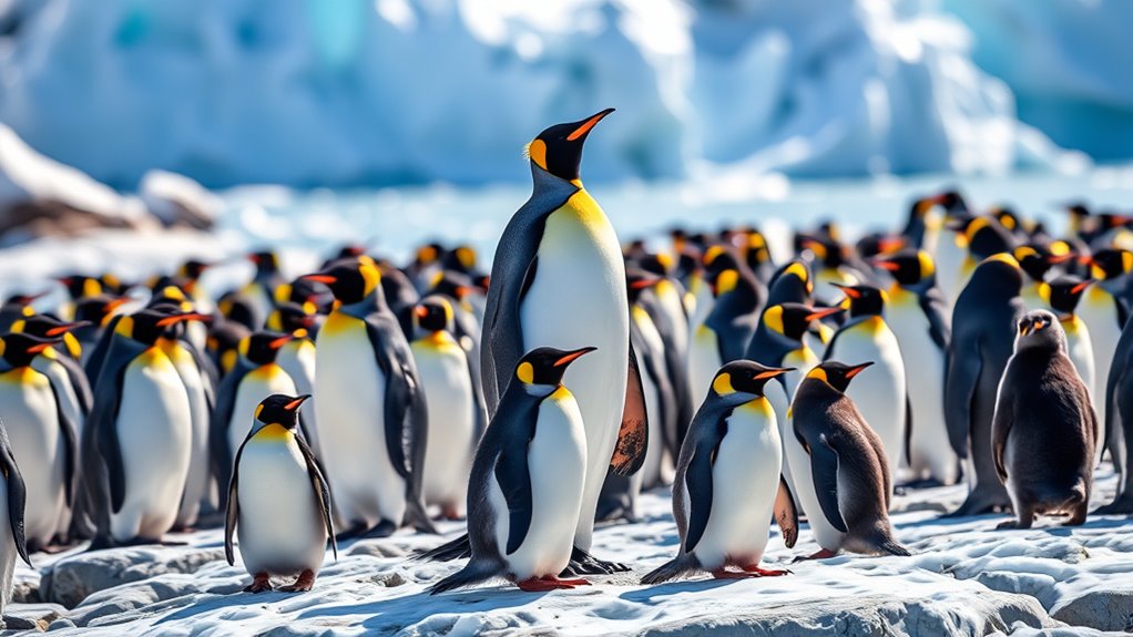 Penguins adapt to climate change like seasoned travelers steering through shifting landscapes. You’ll notice their migration patterns change, guiding them to cooler waters as temperatures rise. During breeding seasons, they adjust their nesting behaviors, seeking safer, more stable environments to protect their young. These clever birds rely on instinct and cooperation, ensuring their survival despite the unpredictable storms of a warming world. By evolving together, they demonstrate resilience in the face of adversity.