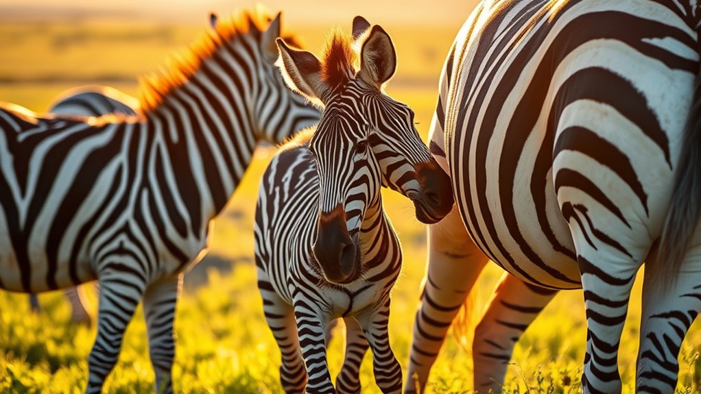 Zebras have stripes mainly for camouflage, social signaling, and temperature regulation. Those stark black and white patterns confuse predators and help zebras recognize each other within herds. Stripes also assist in staying cool in hot environments. Each zebra’s unique pattern reflects its identity, strengthening social bonds. All these functions enhance their chances of survival. If you’re curious about how these stripes work in different environments, there’s plenty more to discover!