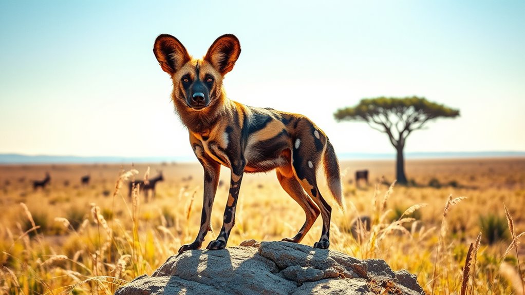 The African wild dog, known for its mesmerizing mottled coat, is an extraordinary predator in the savanna. Its unique fur pattern helps it blend seamlessly into its environment, enhancing its hunting prowess. These dogs are masters of endurance hunting, using teamwork and communication to tire their prey over long distances. Their strong social bonds and cooperative behaviors contribute to their success as hunters and caregivers. If you explore further, you’ll discover even more fascinating details about these painted predators.