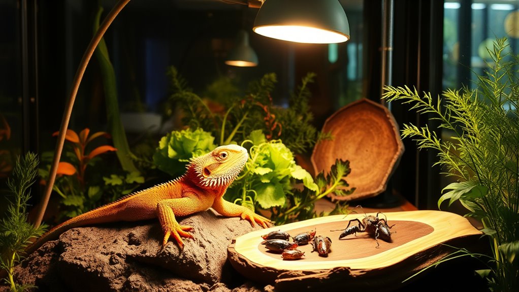 How can you guarantee your bearded dragon thrives in its new home? First and foremost, you need to focus on creating an environment that meets its specific needs. Heat and light are paramount for these reptiles, as they rely on the warmth of their surroundings to regulate their body temperature. Set up a basking area with a heat lamp that provides temperatures around 100-110°F (38-43°C) during the day. This’ll ensure your dragon gets the energy it needs to digest food and remain active. Don’t forget to include a cooler side in the enclosure, allowing your dragon to move to a more comfortable temperature when it wants to cool down.