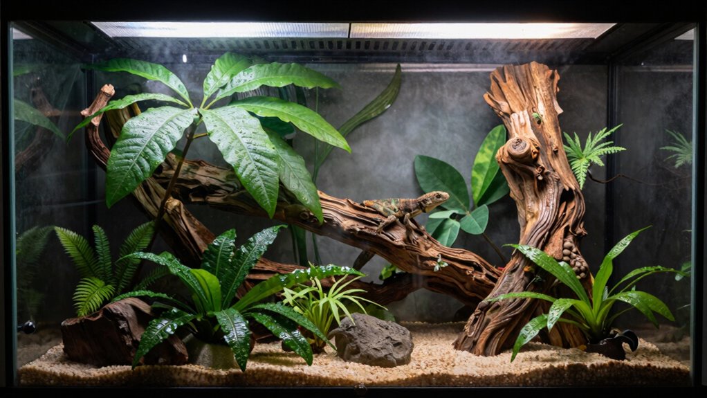 Think of your terrarium as a miniature rainforest; choosing the right materials is key to humidity control. Materials like sphagnum moss, coconut fiber, and water-retentive substrates excel at holding moisture, creating a lush environment. These selections directly influence humidity levels and help maintain a stable climate. By prioritizing the right material selection, you guarantee your reptile’s habitat stays comfortably humid, mimicking its natural rainforest home.