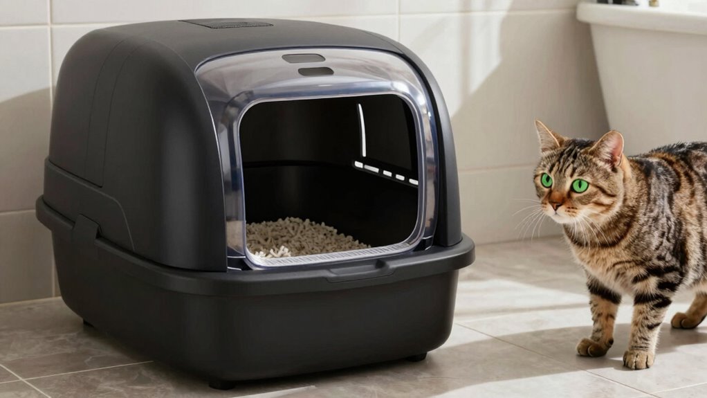 Think of your self-cleaning litter box as a fortress, but even fortresses face breaches. It effectively reduces bacterial growth through automatic sanitation maintenance, preventing buildup. However, it doesn’t eliminate all bacteria; some may develop resistance over time. You still need to regularly monitor and clean the unit to guarantee ideal hygiene. While it’s a helpful tool, don’t rely on it alone—personal vigilance keeps your cat’s environment truly safe.