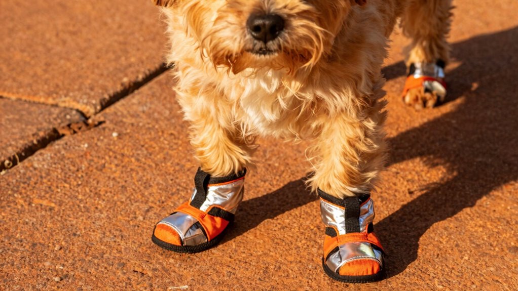 You’re hitting the nail on the head by asking about materials for hot pavement protection. For durability, look for booties with tough, heat-resistant fabrics like neoprene or rubber soles, which can withstand the grind of hot sidewalks. Consider material considerations like breathability to prevent your pup’s paws from sweating. These materials guarantee your dog’s paws stay safe and comfortable, turning a risky walk into a walk in the park.