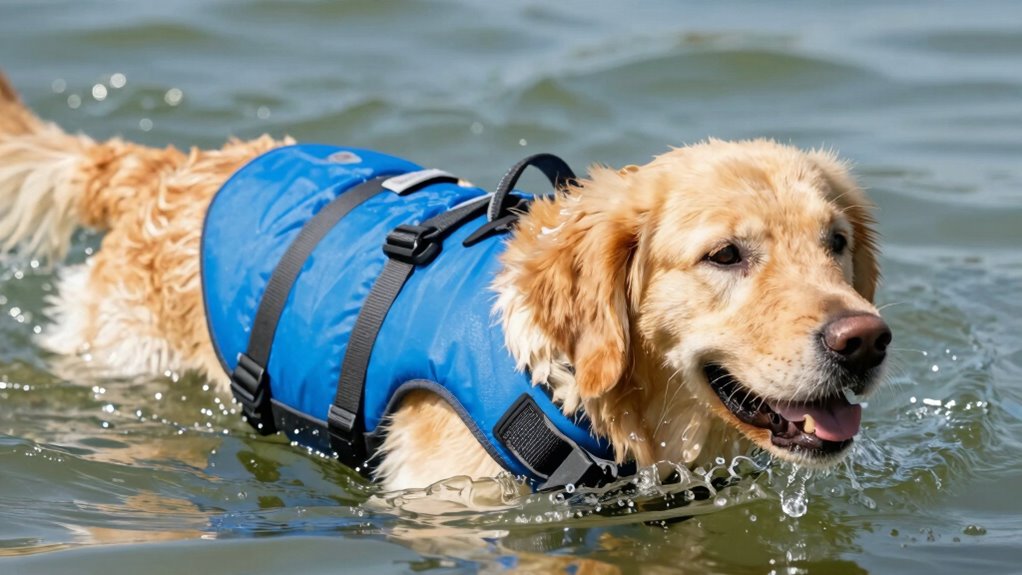 Choosing the right dog life jacket begins with understanding your dog’s unique size and swimming needs. To guarantee comfort and safety, adjust straps so the jacket fits snugly without restricting movement or breathing. Look for models that align with current dog fashion trends, offering both style and function. When selecting, consider your dog’s activity level and training methods—some dogs need more secure fit during vigorous swims, while others prefer a looser feel. Always check the fit by observing your dog’s behavior; if they seem uncomfortable or try to remove the jacket, readjust accordingly. Proper adjustment prevents chafing and ensures buoyancy works effectively. Remember, a well-fitted life jacket boosts confidence, making swimming enjoyable and safe for your furry friend.