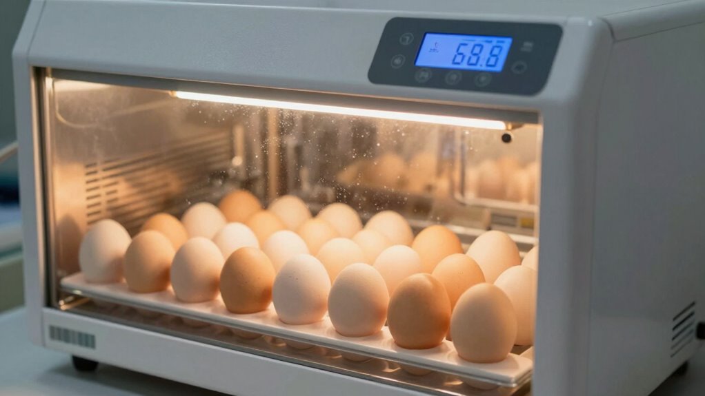 Imagine your eggs are dancers needing the perfect spin to stay balanced—so you should rotate them about 3-5 times daily. Regular egg turning prevents the embryo from sticking to the shell, which is why maintaining good incubator hygiene is vital. Keep the incubator clean and handle eggs gently. Consistent turning ensures even heat distribution, boosting hatch success. Don’t forget, a disciplined routine makes all the difference!