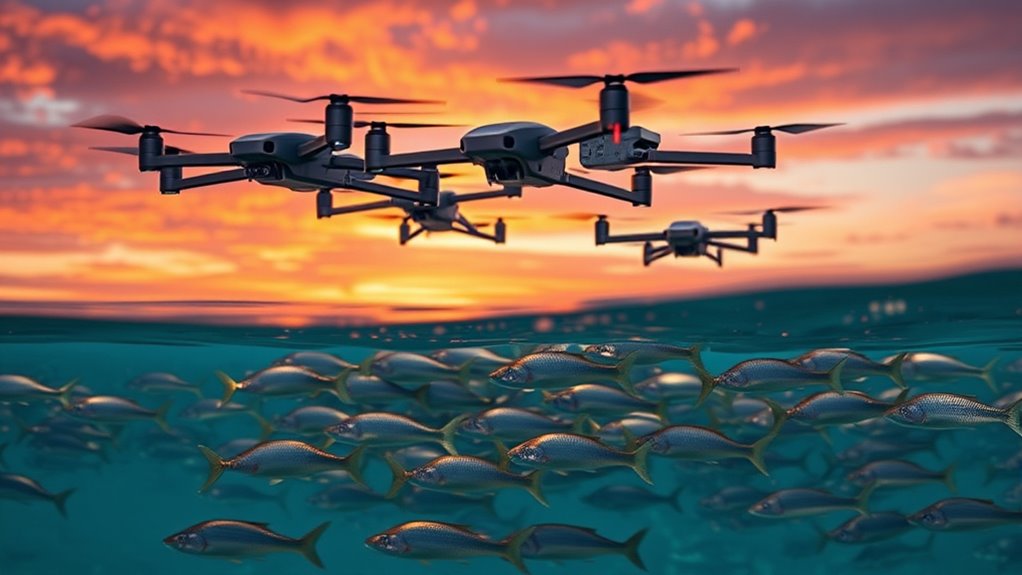 Using a fish schooling algorithm helps your swarm drones coordinate naturally by mimicking how fish swim together. It relies on simple rules like alignment, separation, and cohesion to promote cooperation, adaptability, and resilience. This biologically inspired approach enables your drones to avoid obstacles, optimize paths, and respond quickly to changes in the environment. If you keep exploring, you’ll discover how these behaviors can markedly boost your swarm’s efficiency and flexibility in diverse tasks.