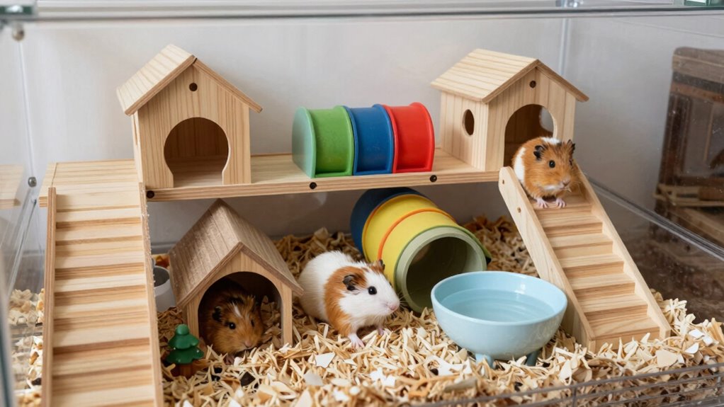 Adding tunnels and toys can greatly reduce stress in small cages, like giving a child a favorite hiding spot. Make sure tunnel safety by checking for sharp edges, and select toys that are safe and stimulating. I once saw a gerbil feel more confident after it had a cozy tunnel to retreat to. These enrichments encourage activity, reduce boredom, and make your pet feel secure, promoting overall health and happiness.
