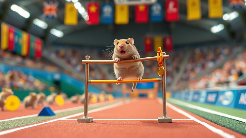 Imagine tiny vaults filled with suspense, but don’t worry—your gerbils’ safety is prioritized. During the tiny pole vault, specialized gerbil safety measures are in place, including soft landing pads and gentle barriers. Tiny vault precautions like controlled heights and supervised jumps prevent accidents, ensuring your gerbils stay secure and healthy. You can enjoy the excitement, knowing that safety always comes first in this adorable, miniature sport.