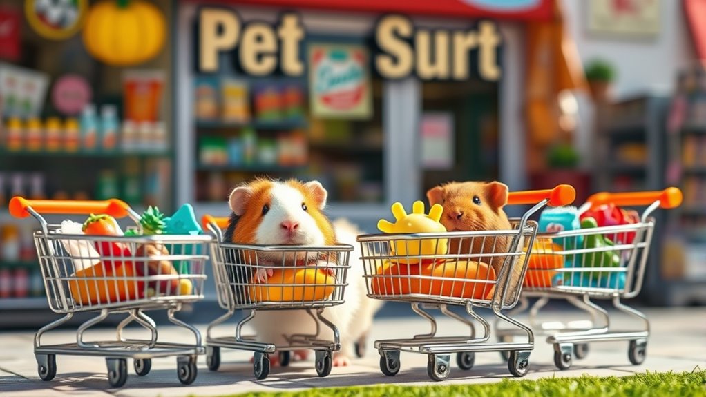 Guinea pig grocery carts now hit pet stores, turning shopping into a fun, engaging activity for your small pet. These carts let you combine treats, habitat accessories, and obstacle features to create stimulating environments that promote exploration and healthy habits. They’re designed with safety and ease of use in mind, helping prevent boredom and stress. Curious about how to make the most of this playful trend? Keep exploring for tips and ideas to enhance your guinea pig’s experience.