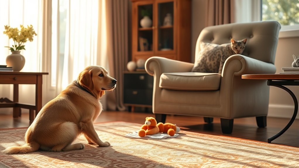 You’ll know the introduction’s successful when you see positive pet body language. Look for calm behavior cues like relaxed tails, soft eyes, and gentle sniffing. If your pets are taking turns approaching each other without growling or hiding, that’s a great sign. They might even engage in playful behavior, which shows they’re comfortable together. Keep an eye out for these signals to make certain they’re forming a positive relationship.