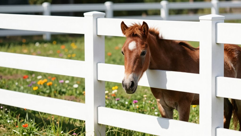 Have you ever wondered which gaps in fencing are most likely to let mini horses escape? Mini horse behavior plays a role; they’re curious and can squeeze through surprisingly small openings. Typically, gaps larger than 3 inches high or wide are risky. Even tiny holes near fence posts or at joints can be enough for a mini to slip through. Fencing regulations emphasize the importance of secure barriers for small equines, so it’s essential to inspect your fence regularly. Remember, mini horses are agile and determined, so what seems safe for larger horses might not suffice. Ensuring all gaps are closed and properly maintained helps prevent escapes. Understanding their behavior and adhering to fencing standards keeps your mini horses safe and contained. Regular testing for fence integrity can help identify weak spots before an escape occurs. Additionally, using appropriate materials designed for small animals can enhance fence durability and security. Properly installed fences with small animal-friendly designs can significantly reduce the risk of escapes and keep your minis safe, especially when combined with routine fence inspections to spot potential vulnerabilities early.