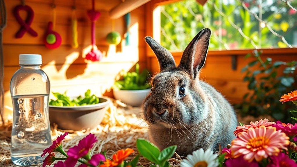 To care for your rabbit, focus on three main areas: housing, diet, and bonding. Give them a spacious, clean living environment with plenty of fresh hay and suitable fresh vegetables. Establish a consistent feeding schedule for stability and digestion. Spend quality time with your rabbit to strengthen your bond through gentle play and treats. Keeping an eye on their health is essential for their happiness. There’s plenty more to explore about ensuring your rabbit thrives.