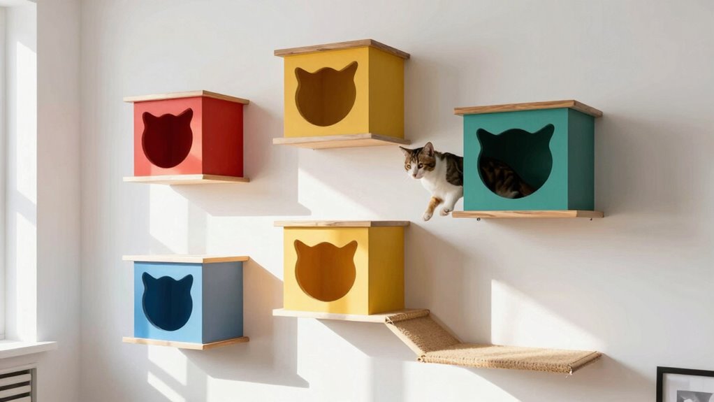 To securely mount cat climbing shelves, I start by choosing sturdy wall anchors suitable for your wall type. I locate studs using a stud finder and mark where I want the shelves. I then drill pilot holes into the studs, attach brackets with screws, and guarantee everything is level. Finally, I mount the shelves securely onto the brackets, making sure they’re stable and safe for your cat to climb and perch on.