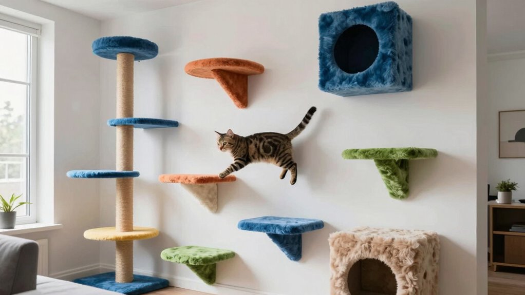 Looking for the best cat climbing wall sets for your apartment in 2026? I’ve found top options that save space, are durable, and keep your feline friends active. From sleek wall-mounted shelves to multi-level setups with cozy perches and scratching posts, these sets fit small spaces while supporting cats of all sizes. If you want more details on these innovative designs that blend function and style, keep exploring the options ahead.