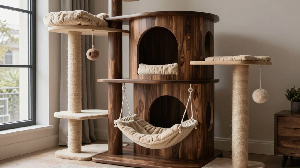 A versatile cat tower condo should offer multiple levels and features that cater to different feline preferences, making it an adaptable addition to any space. I look for designs with modular components or easy reconfiguration options, so I can adjust the setup as needed. Incorporating various textures like plush fabrics and sisal not only adds comfort but also encourages scratching and play. I also prefer structures that include integrated toys or accessories, combining entertainment and relaxation in one unit. The layout should maximize space, creating zones for activity, observation, and privacy without cluttering the room. Overall, a flexible design ensures my cats stay entertained and comfortable, while fitting seamlessly into my living environment, regardless of size or layout constraints.