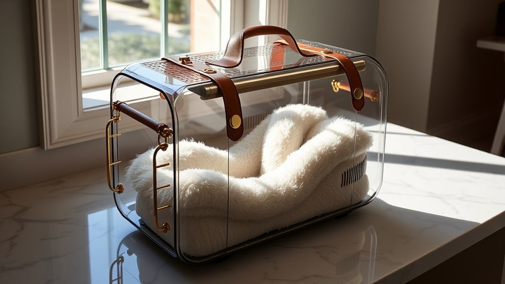 Imagine a carrier that’s both a fashion statement and a cozy retreat. I’ve found that designer carriers balance aesthetics with ventilation by incorporating stylish yet breathable mesh panels or perforated materials. These elements blend seamlessly into sleek designs, ensuring your pet stays cool while looking chic. It’s all about smart design choices—where beauty meets practicality—so your pet feels comfortable without sacrificing style.