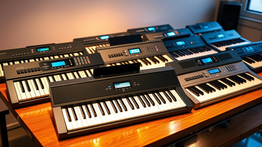The sound quality and variety of voices are essential factors that can markedly enhance your playing experience. High-quality digital pianos offer a broad selection of realistic instrument voices, from grand pianos and electric pianos to strings and organs, allowing you to explore different musical styles. Features like layered dual modes, reverb, chorus, and adjustable volume deepen the immersion and richness of the sound. The number of polyphony voices, typically between 128 and 256, ensures smooth performance even with complex arrangements. Authentic sound reproduction relies on advanced sampling technology and high-fidelity speakers that capture subtle nuances of acoustic instruments. The diverse and realistic voices expand your expressive capabilities, making the instrument suitable for practice, recording, or live performances.