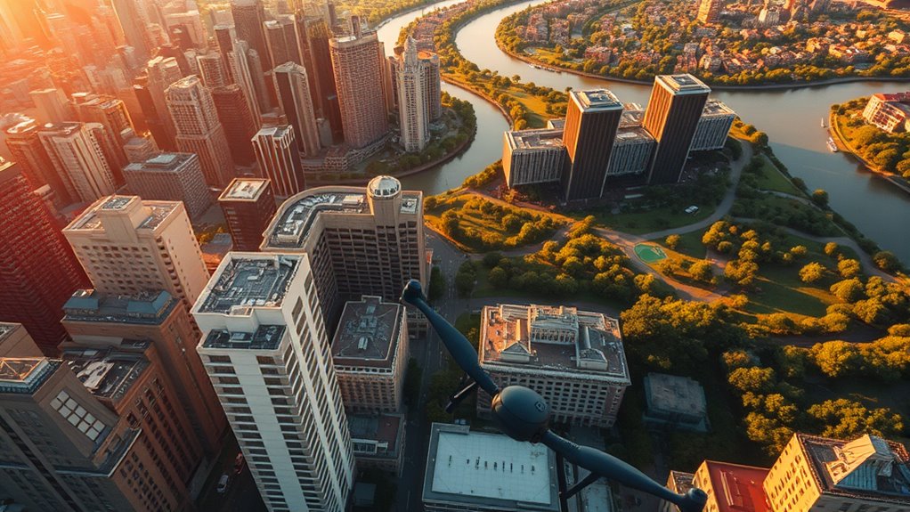 Stabilization technology plays a vital role in capturing smooth, professional-quality 4K footage from drones. Advanced stabilization systems like 3-axis gimbals actively compensate for drone movements across pitch, roll, and yaw, ensuring steady shots even in wind or during fast maneuvers. Electronic image stabilization (EIS), on the other hand, processes the footage digitally to reduce jitters, especially useful in lightweight drones with minimal mechanical stabilization. The best setups combine optical and electronic stabilization methods, minimizing vibrations, motion blur, and unwanted vibrations for crisp, clear videos. This technology is essential for capturing sharp, high-quality footage during complex or rapid movements, considerably enhancing the overall viewer experience. Reliable stabilization makes the difference between shaky clips and cinematic-quality aerial shots.
