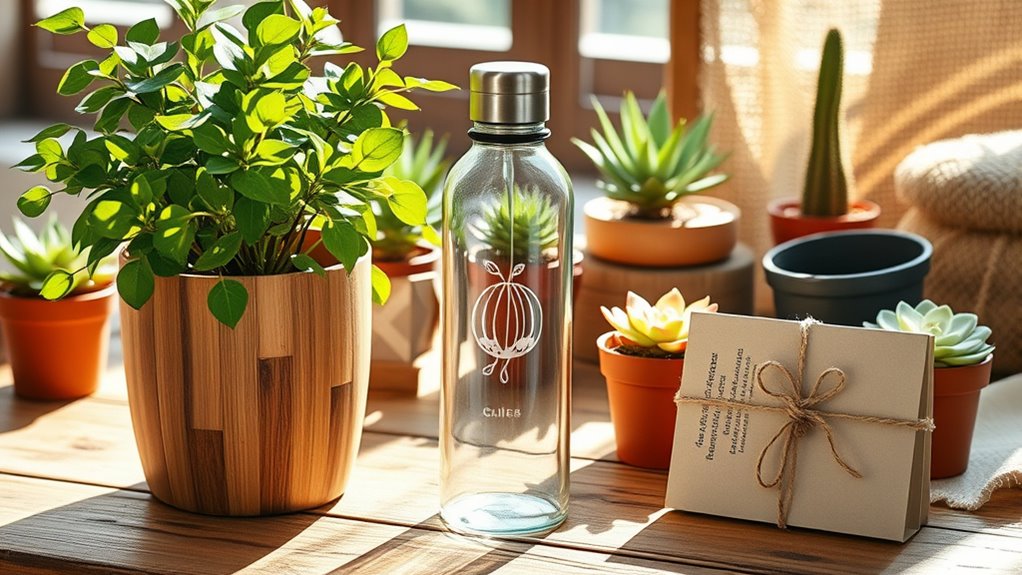 Have you considered how personalization can transform an eco-friendly gift into something truly special? Adding engravings, custom messages, or monograms makes the gift more meaningful and memorable. Personalized packaging or wrapping also creates a unique connection, showing thoughtfulness while emphasizing sustainability. Incorporating the recipient’s interests or hobbies into the design boosts the gift’s usefulness and appeal, making it more likely to be appreciated long-term. Using eco-conscious labels or tags with personalized messages can raise awareness and reinforce the gift’s eco-friendly values. Tailoring the gift to reflect the recipient’s lifestyle enhances practicality and shows you’ve put extra effort into choosing something that truly resonates. Personalization not only elevates the gift but also deepens the impact of your sustainable giving.