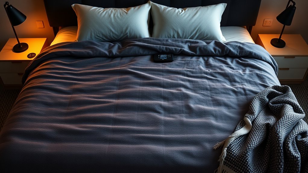 Selecting an electric blanket with adjustable heating levels allows you to tailor your comfort precisely. With multiple heat settings, you can go from a gentle glow to a warm, cozy heat, typically between 83°F and 127°F. Having at least 10 different options gives you fine control over your preferred temperature, ensuring everyone’s comfort. Dual control systems are especially beneficial, letting each side of the king-size blanket be set to a different warmth level. Many models feature digital or LED displays, making it easy to select and monitor settings. Some even include memory functions that save your favorite heat levels for quick adjustments in the future. This flexibility guarantees you stay comfortably warm all night without unnecessary fuss.