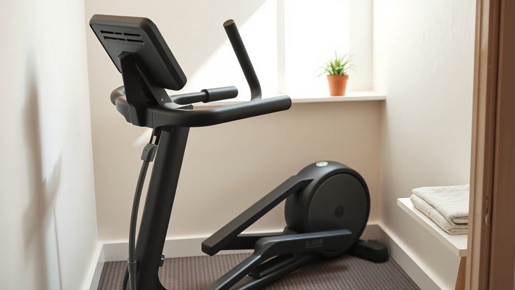 When selecting an elliptical for a small space, ease of assembly can make a big difference in how quickly you start your workouts. Many models are designed for quick setup, with about 90% pre-assembled components, allowing you to get started in just 20 to 45 minutes. Clear, detailed instructions or online video tutorials can further simplify the process, saving time and reducing frustration. Compact ellipticals often include integrated transport wheels, making it easy to move or store the machine when needed. Minimal assembly steps—like attaching pedals and handles—are common in space-saving models, streamlining setup. Additionally, lightweight options around 60-100 pounds make repositioning easier during cleaning or rearranging your workout area, enhancing overall convenience.