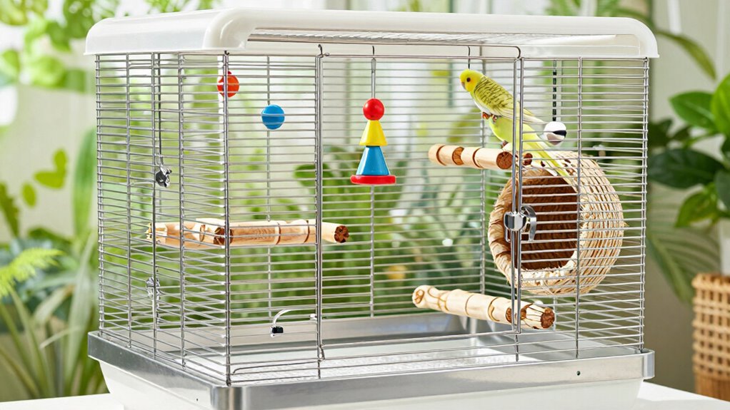 Did you know that stainless steel cages are 100% non-toxic and resistant to rust? I recommend using stainless steel or powder-coated cages because they’re easy to clean, durable, and safe for your birds. Avoid those with paint or coatings that can chip or contain harmful chemicals. Regularly wiping down with bird-safe disinfectants keeps everything hygienic and minimizes health risks, making maintenance straightforward and your birds happy.