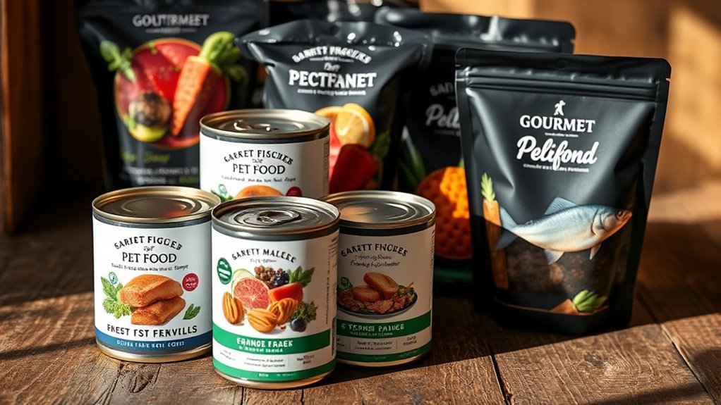 If you want to spoil your pet with the best, I recommend exploring some top gourmet brands like Rachael Ray Nutrish, YOUR PETS KITCHEN, I and Love and You, and Fromm. These options feature real meat, wholesome ingredients, and luxurious flavors that will make mealtime special. They also offer various textures, packaging, and formulations to meet your pet’s needs. If you keep going, you’ll discover more about these fantastic choices to treat your furry friend like royalty.