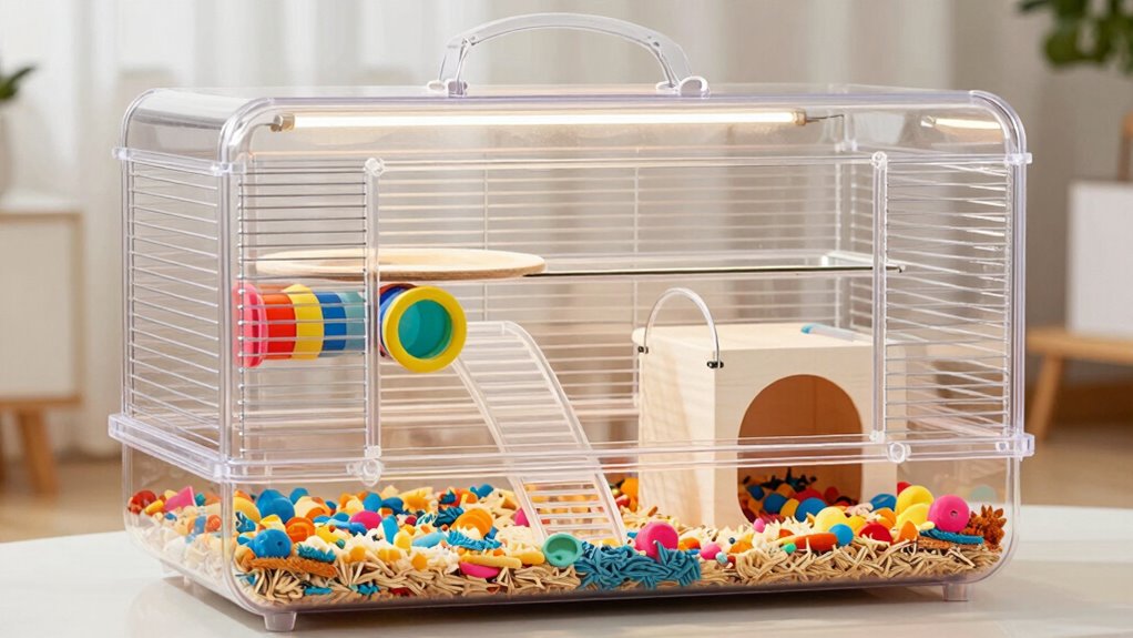 Acrylic enclosures are favored for their high transparency, which allows me to easily observe my hamster and strengthen our bond. Beyond clear visibility, durability is essential; acrylic resists cracking, scratching, and wear, making it a reliable long-term choice. Safety features like chew-proof panels prevent escapes and damage from gnawing, ensuring my hamster stays secure. Proper construction with reinforced acrylic and secure locks reduces the risk of accidents or structural failure. High-quality acrylic enclosures are also designed to withstand regular cleaning and environmental factors, maintaining hygiene and safety over time. When selecting an enclosure, I prioritize durability and safety to create a secure, lasting habitat that keeps my hamster safe, healthy, and happy.