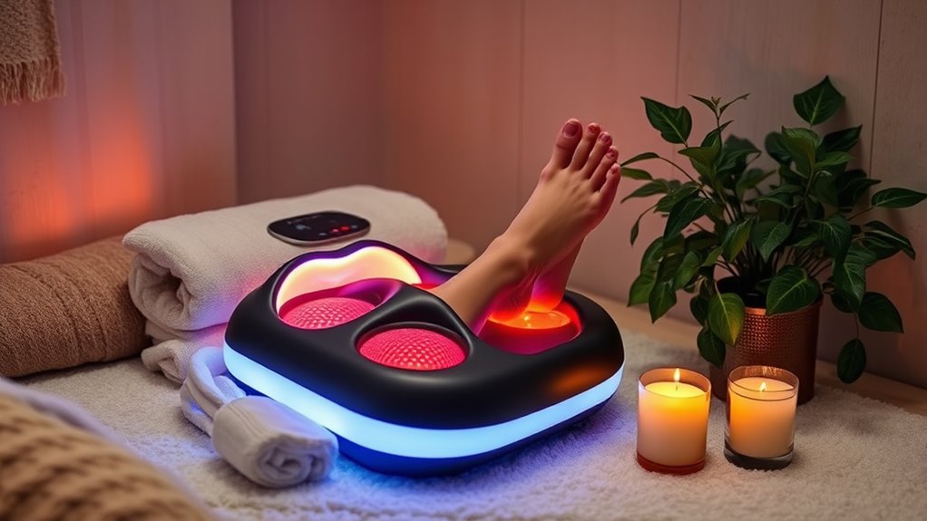 When selecting a heated foot massager for home spa relaxation, considering additional therapeutic features can considerably enhance the overall experience. Features like red light therapy, ozone sterilization, or UV sanitation not only promote skin renewal but also guarantee hygiene and foot health. Incorporating massage rollers, shiatsu nodes, or vibration functions provides targeted relief for sore muscles, boosts circulation, and reduces stress. Some models include herbal infusion compartments or are compatible with Epsom salts, offering natural healing benefits like skin softening and discomfort relief. Others feature red or blue light therapy to decrease inflammation and alleviate pain. The best devices combine multiple therapies—heat, massage, light treatments, and bubbles—delivering all-encompassing care that transforms relaxation into an effective, spa-like treatment at home.