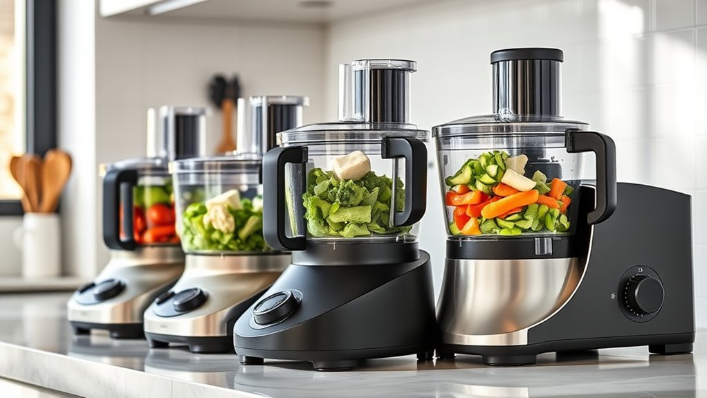 Versatile functionality options are key to maximizing the value of a high-capacity food processor, allowing me to tackle a wide range of meal prep tasks with just one device. Many models come with multiple preset programs for chopping, slicing, pureeing, and dough making, making my prep process faster and more efficient. Some processors feature dual bowls or interchangeable blades, so I can switch functions without swapping devices. Adjustable speed controls and reversible discs give me precision, letting me customize results based on ingredients and textures. Accessories like shredding, slicing, and grinding discs expand my options further, reducing the need for multiple gadgets. Plus, a powerful motor (usually 600W or more) guarantees smooth processing of large quantities and tough ingredients, supporting versatile culinary tasks with ease.