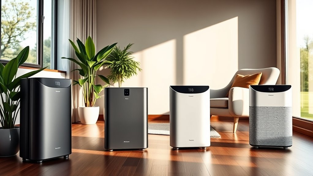Choosing the right high-end air purifier hinges on understanding its filtration technology, as this determines how effectively it removes allergens and pollutants. HEPA filters are a must, capturing 99.97% of airborne particles as small as 0.1 micrometers, including pollen, dust, and pet dander. Many advanced units add activated carbon or charcoal layers to eliminate odors, fumes, and VOCs. Some purifiers feature multi-stage filtration—pre-filters, HEPA, and chemical absorbers—that target a wide range of indoor pollutants simultaneously. Specialized filters like Toxin Absorbers or Smoke Removers enhance performance against specific threats like wildfire smoke or chemical fumes. Additionally, real-time sensors automatically adjust filtration levels, ensuring continuous, optimized air quality. Understanding these technologies helps me choose a purifier that effectively tackles my allergy triggers.