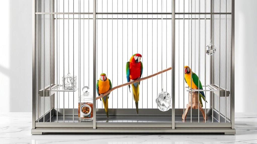 Stainless steel and powder-coated metal are my top choices for bird safety and durability. Stainless steel resists rust, is non-toxic, and easy to clean, making it ideal for long-term use. Powder-coated metals add strength and vibrant style without harmful chemicals. I always avoid cages with cheap coatings or painted surfaces, as they can chip and endanger my birds. These materials guarantee my feathered friends stay safe and happy for years.
