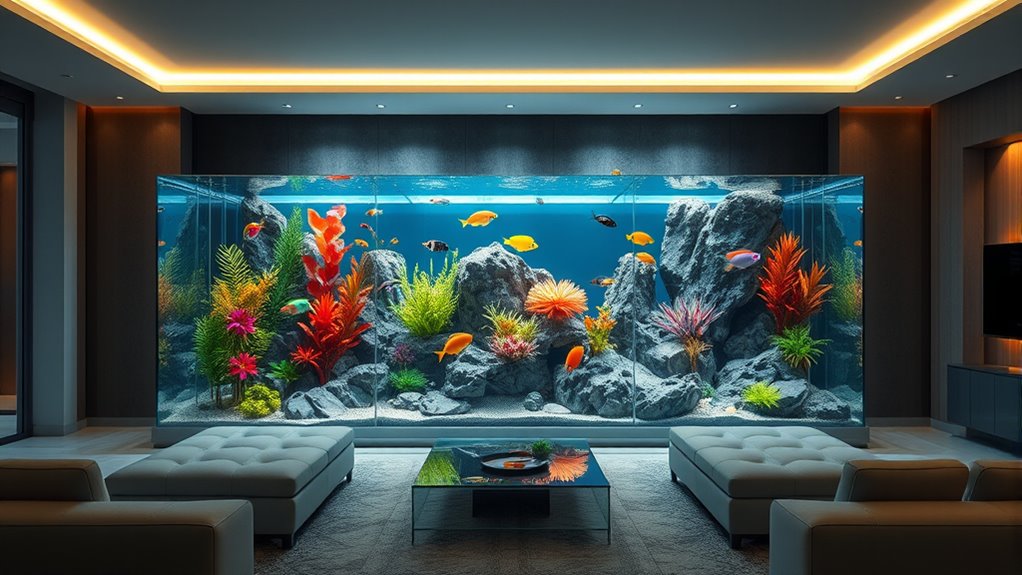 Imagine glancing at your tank, and it adjusts itself. I love how high-end aquariums integrate smart tech—auto-feeders, LED lighting, and temperature controls sync seamlessly via apps. These systems monitor water quality, alerting me to issues before they arise. It’s like having a personal aquarium butler, making maintenance effortless and ensuring my fish thrive while I enjoy the luxury without constant hands-on effort.