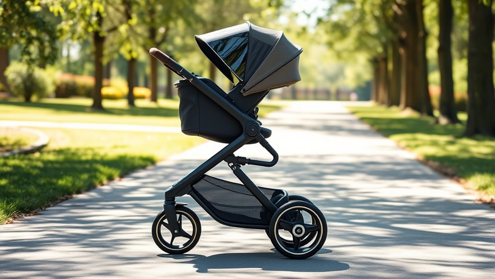 Luxury strollers strike the perfect balance by blending plush padding with rugged materials that stand the test of time. I love how they use high-quality fabrics and reinforced frames to guarantee durability without sacrificing comfort. Think of it as a finely tuned orchestra—each element working harmoniously. This way, your little one enjoys a smooth ride, and the stroller holds up beautifully through all your adventures.