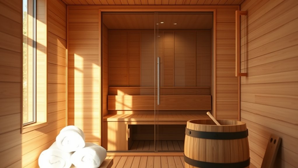 Selecting the right heating technology for your home sauna kit hinges on understanding how each type delivers heat and fits your wellness goals. Infrared sauna kits use carbon or ceramic panels to emit infrared light that heats your body directly, offering quick warmth without markedly warming the air. Steam sauna systems generate moist heat through a water-steam generator, creating a humid environment ideal for relaxation and detoxification. Traditional dry saunas rely on electric or wood-burning heaters to warm the air, producing a hot, dry atmosphere perfect for sweat therapy. Some kits combine infrared and steam technologies, providing both deep tissue heat and humid steam for enhanced benefits. Your choice affects energy efficiency, heat distribution, setup complexity, and the overall therapeutic experience, so consider what aligns best with your preferences.