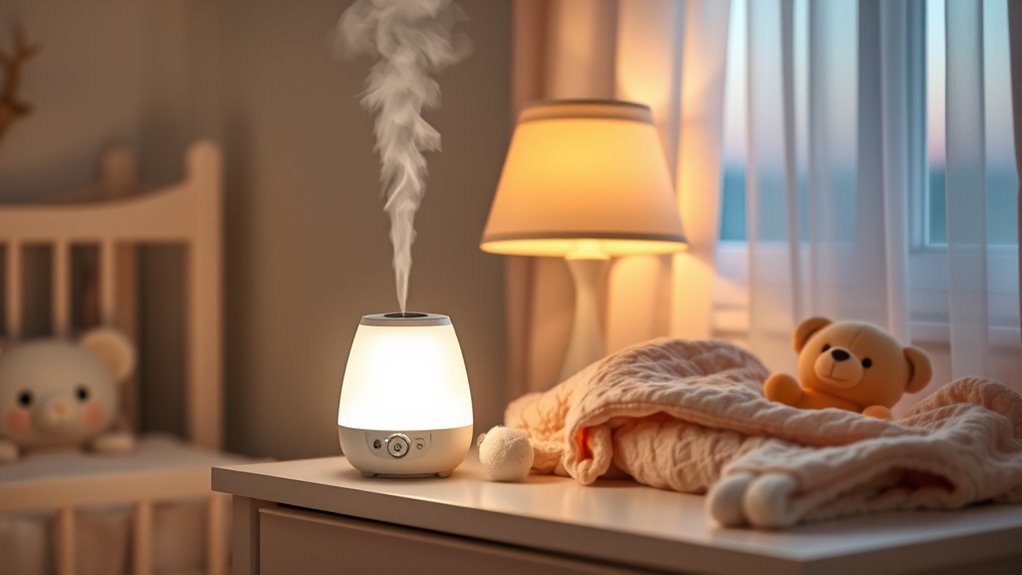 The ideal humidity level for a baby’s room is between 40% and 50%. I make sure to monitor this with a hygrometer to keep the air comfortable and prevent dryness or excess moisture. Maintaining this range helps soothe congestion, dry skin, and coughs, while also reducing mold growth. I always adjust the humidifier settings as needed, especially during seasonal changes, to make certain my little one stays comfy and healthy.