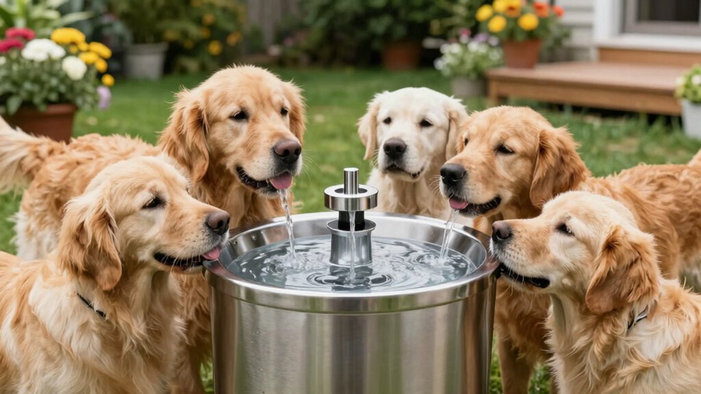 Absolutely, large water fountains are perfect for multiple dogs at once. I’ve found they keep everyone’s water clean and accessible, especially if you have a busy household. With a bigger capacity, there’s less frequent refilling, and my dogs love having fresh water available all day. Just make certain the fountain is easy to clean and the filters are maintained regularly. This way, everyone stays hydrated and happy.