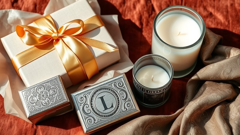 Personalization options can substantially elevate a luxury gift, making it feel more thoughtful and unique. Adding engravings, custom messages, or monograms transforms an ordinary item into a meaningful keepsake she’ll cherish. You can choose specific colors, patterns, or designs that reflect her personality and preferences, ensuring the gift feels tailored just for her. Engraved or monogrammed pieces often create a sense of exclusivity, making the gift more memorable and special. Incorporating significant dates or meaningful quotes adds an emotional touch that she’ll appreciate. Personalization can be achieved through various methods like engraving, embroidery, or custom packaging, giving you the flexibility to craft a truly personalized experience. These options make your gift stand out and show how much you care.