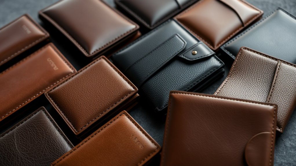 A well-crafted leather wallet balances quality materials with thoughtful design to maximize both usability and style. I look for wallets with multiple compartments that keep cards, cash, and IDs organized, making everyday transactions seamless. Slim profiles are essential—they fit comfortably in pockets without adding bulk, maintaining a sleek appearance. Features like RFID blocking technology are a bonus, offering security against electronic theft. Durability matters too; reinforced stitching and high-quality leather ensure the wallet keeps its structure and looks great over time. The placement of card slots, ID windows, and cash compartments should facilitate quick access and efficient organization. Ultimately, a well-designed luxury wallet combines smart functionality with refined aesthetics, making it a practical yet sophisticated accessory.