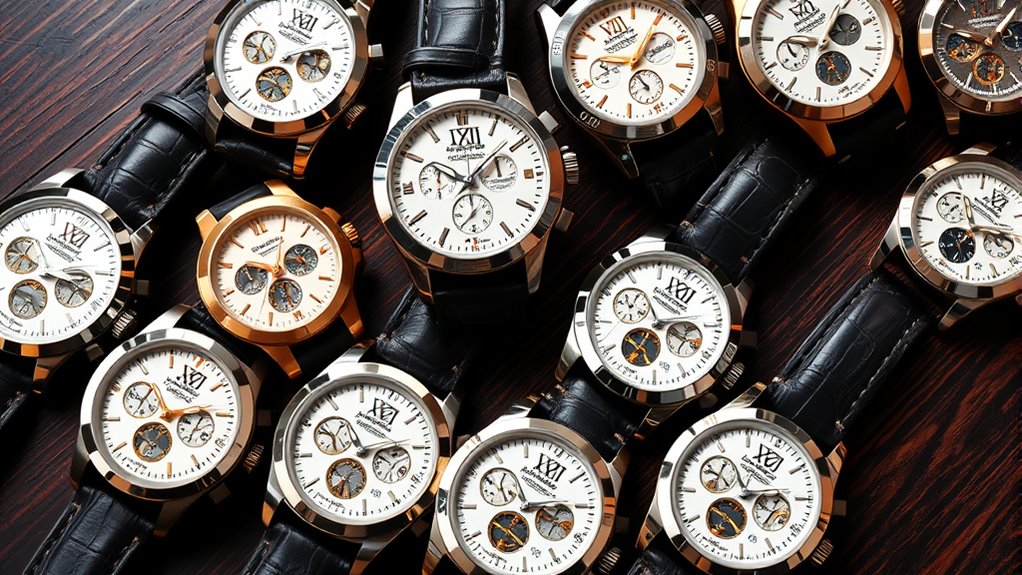 Since durability is essential in selecting a luxury watch, paying attention to the quality of materials used can make all the difference. High-end watches typically feature premium materials like stainless steel, sapphire crystal, and ceramic, which offer increased scratch resistance and longevity. The movement’s quality, whether Swiss or Japanese quartz or automatic calibers, also influences the watch’s precision and lifespan. Water resistance is another vital factor, with ratings of at least 50 meters for everyday wear and higher for active lifestyles. Additionally, the construction of the case and bracelet should be solid, with tight fittings that withstand daily wear and environmental stress. Regular maintenance, including cleaning and replacing worn parts, helps preserve both the material integrity and the watch’s overall resilience over time.
