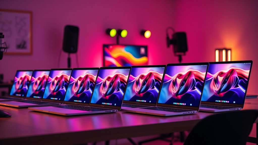 Choosing the right display quality and size is vital for effective live streaming and content creation on a MacBook Pro. A high-resolution display like Liquid Retina XDR offers outstanding clarity and precise color accuracy, indispensable for editing photos and videos. Larger screens, such as 14-inch or 16-inch models, give more workspace for multitasking, detailed editing, and real-time monitoring. Features like ProMotion technology with adaptive refresh rates up to 120Hz ensure smooth scrolling and seamless video playback. Support for native resolution and high contrast ratios allows me to see every detail during editing, while brightness levels of up to 1600 nits deliver vibrant visuals even in bright environments. These display qualities greatly enhance my workflow and visual accuracy.